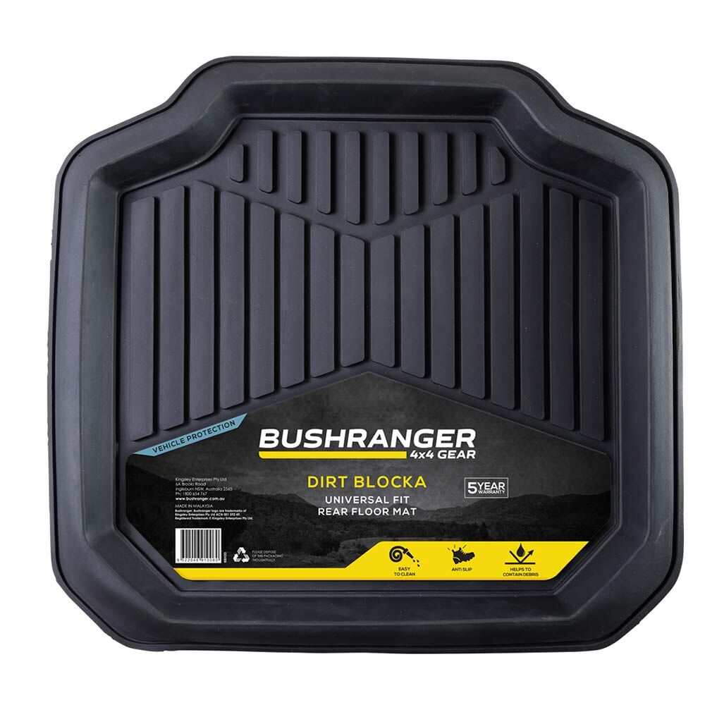 The Bushranger Dirt Blocka Mats designed with deep edges to capture all the debris that is brought into the vehicle, from sand, dirt, mud, snow, even water can be contained within the mats. Made from a solid rubber construction that retains integrity and shape and easy to clean. A 5cm high perimeter ridge to keep debris enclosed from your interior material. Underside of mat features ribs to prevent mat slippage. Generous size to suit even the largest 4x4, they can also be trimmed to suit your foot well.