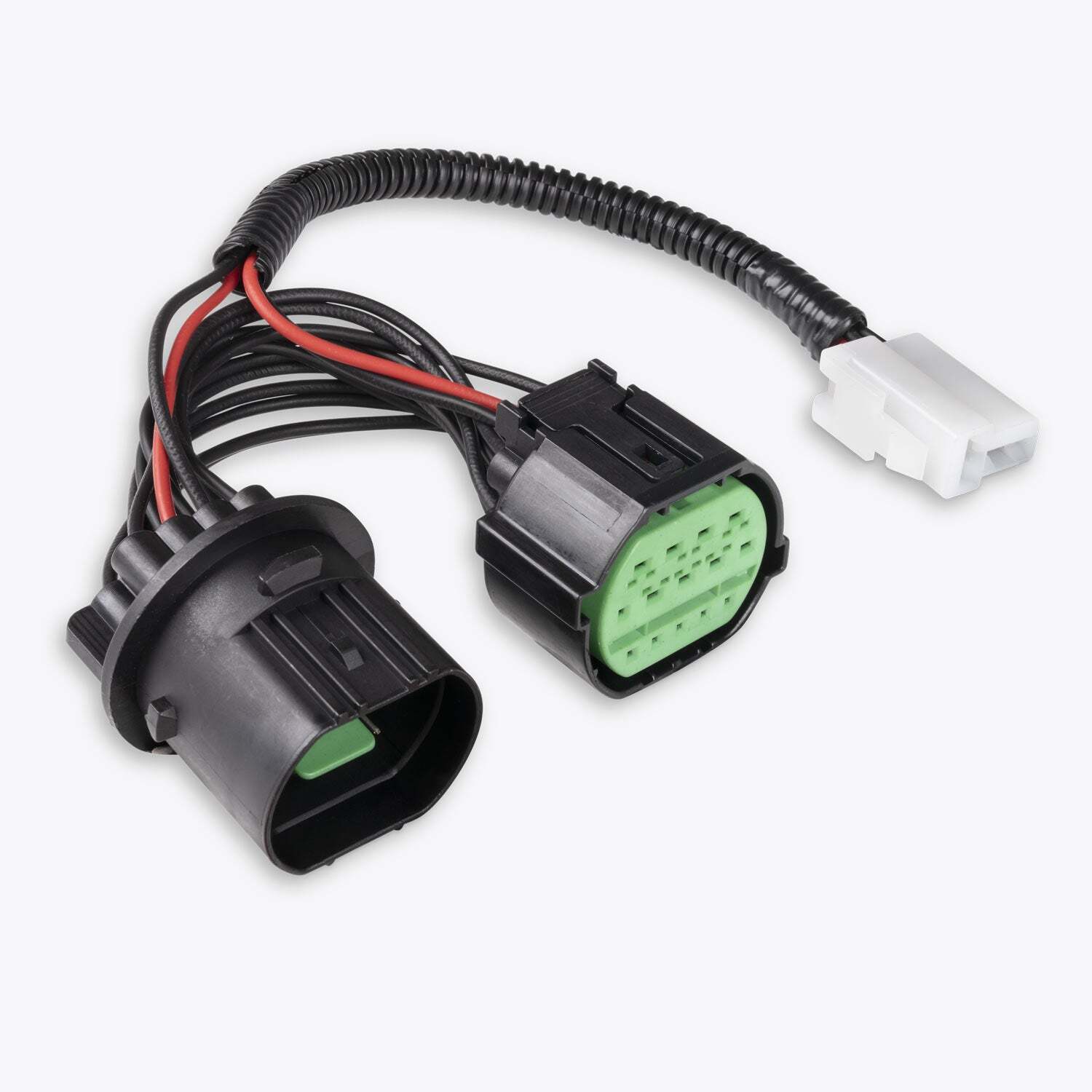 The white T-connector on the back of the adaptor will plug straight into the connector on our wiring harness.