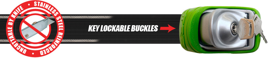 With regular tie-downs anyone can walk up to your car and take your board within 10 seconds, without any tools and without attracting any attention. With KanuLock straps your board or kayak can't be slid out, the straps are reinforced with stainless steel and can’t be cut with a knife, they make less wind noise and are very easy to use. Lock any board or kayak to any roof-rack, it is so simple.